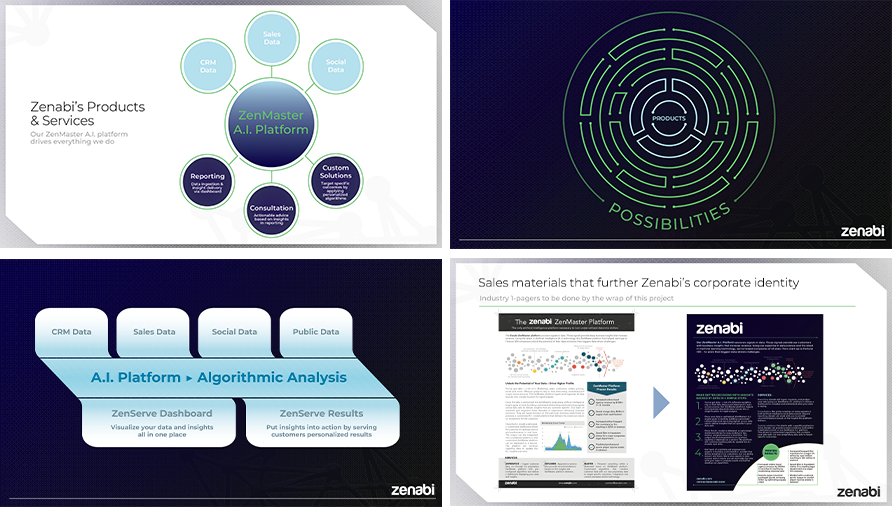 Corporate I.D. and Marketing Strategy for Zenabi Data. Comprehensive corporate slide deck, web design, and marketing materials created to define and distinguish Zenabi’s core products in today’s ever-expanding universe of Artificial Intelligence and Data Science.